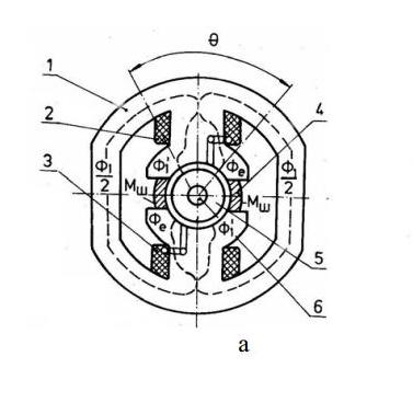1-статор, 2-възбудителни намотки, 3-накъсосъединена намотка, 4-магнитни шунтове, 5-ротор